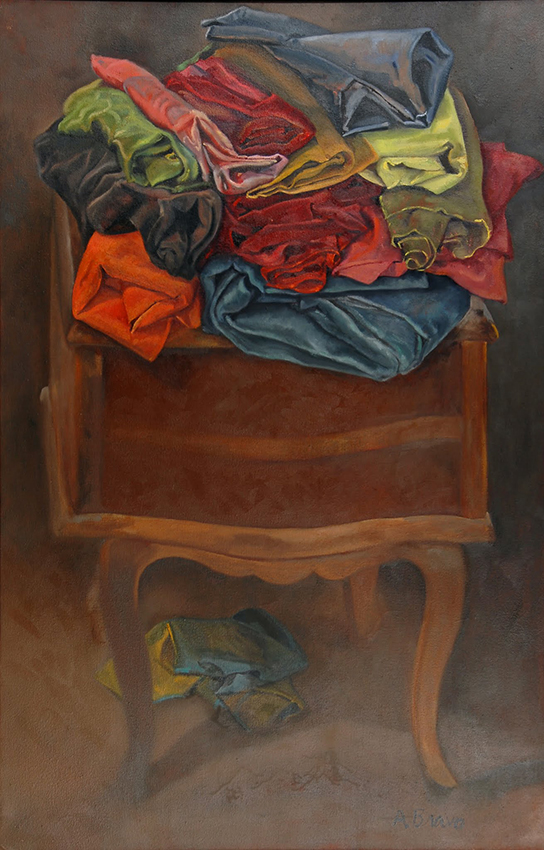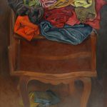 Mesilla con telas, óleo sobre lienzo, 100×65 cms.